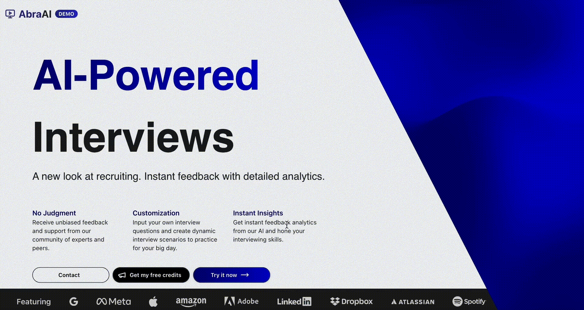 Abra AI utilizes ML speech-to-text models to deliver mock interviews wth instant feedback and criticism of your performance. Choose from a variety of questions commonly used during technical and behvaioral interviews (FAANG, Spotify, Uber, McKinsey, and more). Ace your interview using data-driven insights.